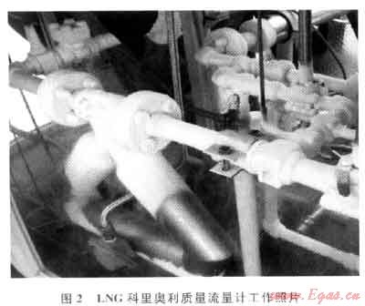 LNG流量計(jì)是整個(gè)LNG加氣機(jī)的核心部件。流量計(jì)的選型直接影響LNG加氣機(jī)的性能。根據(jù)以往石油和天然氣貿(mào)易交接應(yīng)用中所用的流量計(jì)量方法,最合理的LNG流量測量計(jì)包括:差壓(孔板式)流量計(jì)、渦輪流量計(jì)、超聲波流量計(jì)和科里奧利質(zhì)量流量計(jì),其中差壓流量計(jì)和渦輪流量計(jì)是得到公認(rèn)的傳統(tǒng)技術(shù),但用其來測量低溫的LNG時(shí)卻存在一些困難:差壓裝置和渦輪流量計(jì)都會(huì)使流量管內(nèi)的壓力大大降低,這可能導(dǎo)致LNG氣化;差壓流量計(jì)還要求管道上游和下游為長距離直線型布局,計(jì)量的流量范圍不廣。而超聲波流量計(jì)和科里奧利質(zhì)量流量計(jì)被視為新技術(shù),得到了美國石油學(xué)會(huì)(API)、美國天然氣協(xié)會(huì)(AGA)和國際法制計(jì)量組織(OIML)的認(rèn)可,但在LNG貿(mào)易交接過程中使用超聲波流量計(jì)仍存在一些問題,而科里奧利質(zhì)量流量計(jì)是目前應(yīng)用最成功的LNG流量計(jì)。圖2所示的即為使用中的LNG科里奧利質(zhì)量流量計(jì)。目前,美國艾默生旗下的高準(zhǔn)公司生產(chǎn)的CMF系列質(zhì)量流量計(jì)和Endress+Hauser公司生產(chǎn)的83F低溫型質(zhì)量流量計(jì)以其耐低溫和性能穩(wěn)定的優(yōu)點(diǎn)得到了LNG加氣機(jī)行業(yè)的認(rèn)同。但是,LNG加氣機(jī)在加液過程中難免會(huì)發(fā)生LNG的部分氣化,氣液兩相的存在對(duì)科里奧利質(zhì)量流量計(jì)的計(jì)量精度影響很大,其中氣相流量計(jì)量的準(zhǔn)確性對(duì)加氣機(jī)計(jì)量精度有著至關(guān)重要的影響,目前科里奧利質(zhì)量流量計(jì)液相計(jì)量的精度可達(dá)±0.10%,而氣相計(jì)量的精度只有±0.35%,這是需要進(jìn)一步解決的技術(shù)難題[4]。