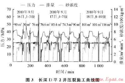 長(zhǎng)深D平2井壓裂施工歷時(shí)3d,創(chuàng)造了中國(guó)石油壓裂史上的3項(xiàng)紀(jì)錄:①水平井深層氣井壓裂級(jí)數(shù)最多(10段);②單井總壓裂規(guī)模最大(838m3);③單級(jí)壓裂規(guī)模最大(116m3)(圖3)。