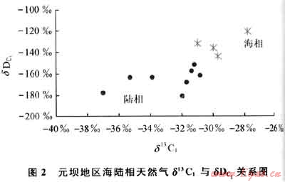 根據(jù)前人對(duì)甲烷氫同位素的研究,通常認(rèn)為烷烴氣的氫同位素首先制約于沉積環(huán)境,其次才是成熟度的影響。Schoell提出天然氣氫同位素組成隨烴源巖熱演化程度的增加變重,陸相淡水環(huán)境生成的熱成因甲烷的氫同位素組成小于-190‰,海相環(huán)境生成的甲烷的氫同位素組成大于-190‰[1]。沈平等研究發(fā)現(xiàn)中國(guó)陸相盆地天然氣甲烷的氫同位素組成介于-255‰~-158‰,其中海陸交互相的半咸水環(huán)境中生成的甲烷氫同位素值(δD)亦大于-190‰,而湖相、沼澤相的淡、微咸水環(huán)境生成的生物甲烷δD值一般小于-200‰[2~5]。王曉峰等對(duì)塔里木盆地海相和陸相環(huán)境生成的天然氣甲烷氫同位素進(jìn)行研究后發(fā)現(xiàn),二者基本以-170‰為界[3~6]。錢志浩等認(rèn)為,四川盆地天然氣由于成熟度和共存水的影響,海陸相天然氣甲烷8D的劃分界限以-160‰為宜[6]。