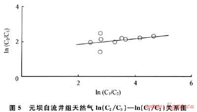 自流井組天然氣ln(C2/C3)值變化很小(處于數(shù)值2附近),在ln(C2/C3)—ln(C1/C2)關(guān)系圖上基本呈一水平直線;而ln(C1/C2)值變化較大(介于2~5)。由此,可以判斷元壩地區(qū)自流井組天然氣主要屬于干酪根裂解氣類型(圖5)??紤]到元壩地區(qū)自流井組天然氣相對(duì)較濕、重?zé)N含量較高的特點(diǎn)及地質(zhì)特征,綜合研究認(rèn)為該區(qū)可能存在少量的原油二次裂解氣。