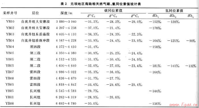 由圖2中可見(jiàn),元壩地區(qū)海相長(zhǎng)興組及飛仙關(guān)組的4個(gè)樣品點(diǎn)均落在右上角,甲烷氫同位素值(δD)大于-150%o;而雷口坡組及以上陸相地層樣品點(diǎn)則位于左下角,其δD普遍小于-150‰。由于二疊系為海相沉積環(huán)境,海水鹽度高,而陸相多為湖泊、沼澤相的淡水或微咸水沉積環(huán)境,水體鹽度低,加之下伏二疊系熠源巖比上覆陸相烴源巖具有更高的演化程度,因此,該區(qū)海陸相天然氣甲烷氫同位素值應(yīng)該同時(shí)受古沉積環(huán)境和演化程度的影響,結(jié)果導(dǎo)致天然氣的δD存在明顯差異。當(dāng)然,母質(zhì)類型也是影響氫同位素分餾效應(yīng)的因素之一。