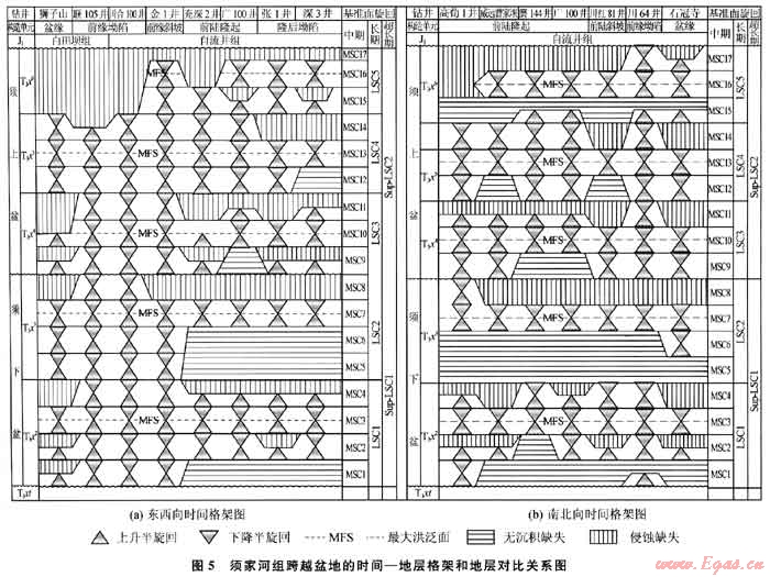 1) 依據(jù)層序界面和最大洪泛面發(fā)育特征,可將四川盆地上三疊統(tǒng)須家河組劃分為分別代表“須下盆”成盆期和“須上盆”成盆期的兩個與構(gòu)造層序相當(dāng)?shù)某L期旋回層序、5個分別對應(yīng)于須二段-須六段的長期旋回層序(LSC1~LSC5)和17個中期(MSC1~MSC17)旋回層序。