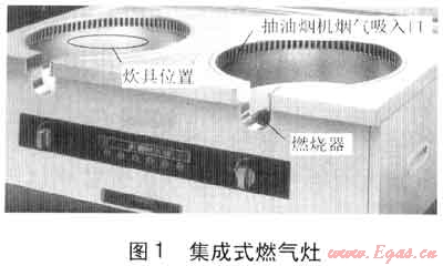 近幾年來,市場上出現(xiàn)了一種集成式燃氣灶,這種燃氣灶最大的特點是,將抽油煙機煙氣吸入口與燃氣灶近距離地集成在一起,見圖1。集成式燃氣灶的抽油煙機煙氣吸入口呈環(huán)型分布在燃燒器頭部的側(cè)上方,從炊具的側(cè)面吸走煙氣。