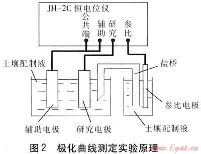 管道的致鈍電流密度、維鈍電流密度、穩(wěn)定鈍化區(qū)電位范圍的測(cè)定方法采用恒電位法[4]。恒電位法就是將研究電極依次恒定在不同的值,然后測(cè)量對(duì)應(yīng)于各電位下的電流。極化曲線(xiàn)的測(cè)量應(yīng)盡可能接近體系穩(wěn)態(tài)。體系穩(wěn)態(tài)指被研究體系的極化電流、電極電位、電極表面狀態(tài)等基本上不隨時(shí)間而改變。在實(shí)際測(cè)量中,常用的控制電位測(cè)量方法有動(dòng)態(tài)法,控制電極電位以較慢的速度連續(xù)地改變(掃描),并測(cè)量對(duì)應(yīng)電位下的瞬時(shí)電流,以瞬時(shí)電流與對(duì)應(yīng)的電極電位作圖,便獲得整個(gè)極化曲線(xiàn)。測(cè)量在實(shí)驗(yàn)室進(jìn)行,需要恒電位儀1臺(tái),飽和甘汞電極1支,Q235A鋼制作的電極1支,鉑電極1支,三室電解槽1只,2L現(xiàn)場(chǎng)土壤配制液,0.5mol/L的H2S04溶液2L,0.85mol/L的丙酮水溶液1.5L。用金相砂紙將Q235A鋼制作的測(cè)試電極打磨至鏡面光亮,用石蠟蠟封,留出1cm2面積,然后在丙酮水溶液中除油,在0.5mol/L的H2S04溶液中去除氧化層,浸泡時(shí)間分別不低于10s,然后按圖2進(jìn)行安裝。圖2中,選用JH-2c恒電位儀作為恒電位的輸出,參比電極選用飽和甘汞電極,輔助電極選用鉑電極,研究電極為Q235A鋼制作的測(cè)試電極。保持25℃環(huán)境,測(cè)量方法采用動(dòng)態(tài)法。
