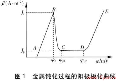 圖1為典型的鈍性金屬鈍化過(guò)程的陽(yáng)極極化曲線(xiàn)。圖1中,橫坐標(biāo)表示陽(yáng)極極化電位φ(單位為mV),縱坐標(biāo)表示電流密度1,(單位為A/m2),AB段金屬發(fā)生活性溶解,稱(chēng)為活化區(qū),在A點(diǎn),金屬為自然腐蝕狀態(tài),在靠近曰點(diǎn)附近,電極極化過(guò)程受到阻礙,可能產(chǎn)生氧化物的薄膜;在BC段,保護(hù)膜的生長(zhǎng)速度已超過(guò)化學(xué)溶解速度,形成保護(hù)膜,這一區(qū)稱(chēng)為鈍化過(guò)渡區(qū),到C點(diǎn)時(shí),整個(gè)表面已被吸附氧化膜所覆蓋;在CD段,陽(yáng)極電流與電位往往沒(méi)有關(guān)系,這一區(qū)為穩(wěn)定狀態(tài),稱(chēng)為穩(wěn)定鈍化區(qū)。隨著電位的升高,膜中氧的含量增加,膜隨之變厚;在DE段,D點(diǎn)的電位相當(dāng)于氧的陽(yáng)極析出電位,氧化膜被氧化成可溶性的高價(jià)氧化物,金屬又開(kāi)始溶解,這一區(qū)域稱(chēng)為過(guò)鈍化區(qū)。