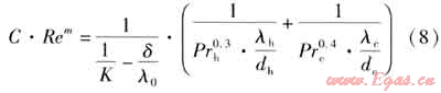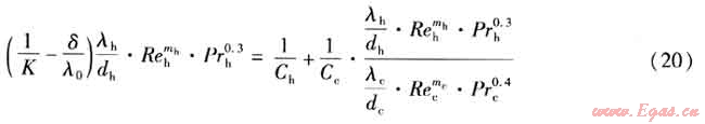 修正威爾遜法的適用條件之一為:在測試時須保持一側(cè)流體的流速不變,而變化另一側(cè)的流速。由于冷熱流體流速不同,其雷諾數(shù)相差較大,因此冷熱兩側(cè)不能采用相似的傳熱準(zhǔn)則方程描述,即冷熱兩側(cè)準(zhǔn)則方程中的C、m應(yīng)分別求取。冷熱兩側(cè)的傳熱準(zhǔn)則方程分別為: