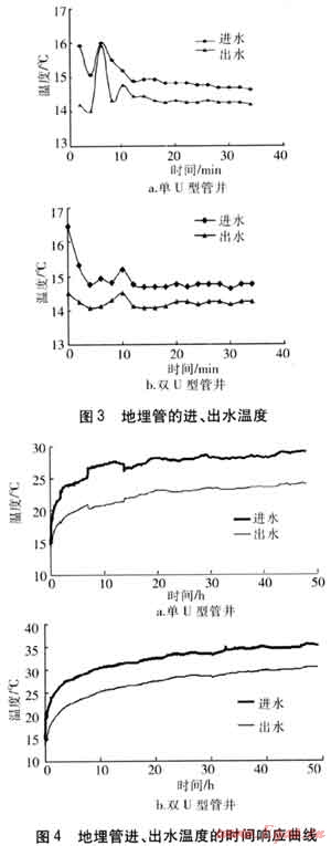 對單U型管井和雙U型管井均進行了熱響應(yīng)測試。測試時保持每口井的加熱功率和供水流量穩(wěn)定,分別記錄48h的進、出水溫度。進、出水溫度的時間響應(yīng)曲線見圖4。由圖4可知,經(jīng)過一段時間后,地埋管的進、出水溫差基本穩(wěn)定,表明地下?lián)Q熱已基本達到了平衡。此時計算得單、雙U型管的平均換熱量分別為47.59、86.44W/m。