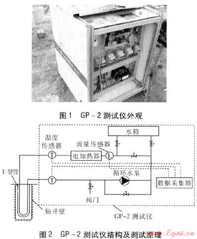 目前的測試裝置均是以擾動-響應(yīng)的方式來推算地下的換熱情況和巖土體熱物性參數(shù)。本次試驗的測試裝置是中國地質(zhì)大學(xué)(武漢)工程學(xué)院研制的GP系列測試儀(GP-2),測試儀外觀見圖1,測試儀結(jié)構(gòu)及測試原理見圖2。GP-2測試儀的測試原理:在鉆孔中埋設(shè)U型管并回填[4],使U型管與測試儀管路連接,形成一個閉合回路。在循環(huán)水泵的作用下,水通過電加熱器加熱升溫后進入U型管,將熱量傳遞給周圍的巖土體,最后流回到測試儀中。通過測試,獲得U型管的進、出水溫度和流量,用以計算巖土體的熱物性參數(shù)。