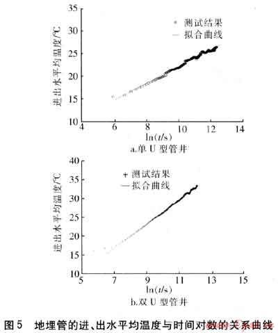 待地埋管進、出水溫差穩(wěn)定后,擬合其平均溫度Tf與時間對數(shù)㏑t的關(guān)系曲線,見圖5。單U型管井擬合曲線公式為Tf=1.866 8㏑t+4.0142,雙U型管井擬合曲線公式為Tf=3.1964㏑t-5.5206,可得擬合曲線的斜率和截距。