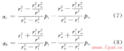 2) 徑向應力和周向應力依據Lame′公式其計算方法如下[10]: