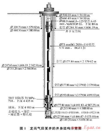四川盆地龍崗氣田某井的井身結構如圖1所示,采用Φ339.7mm+Φ244.5 mm+Φ177.8mm+Φ127mm井身結構,打開儲層鉆井液的密度為1.31g/cm3,折算地層壓力為65MPa。根據鄰井地溫梯度推測地層溫度為114℃,地層流體為天然氣,高含H2S,不產地層水。