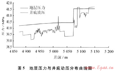 圖4所示的是某井在5087m處地層壓力測(cè)試所得產(chǎn)氣量與井底動(dòng)壓的關(guān)系曲線。根據(jù)MWD實(shí)測(cè)資料,5087m處實(shí)測(cè)垂深為4105m,則可計(jì)算出地層壓力系數(shù)為1.034,回歸計(jì)算結(jié)果與完鉆測(cè)試解釋結(jié)果吻合。