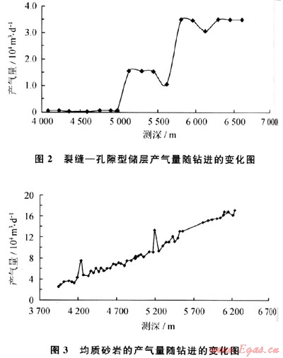 由于鉆遇裂縫和孔隙性基塊會(huì)有不同的產(chǎn)氣量顯示,根據(jù)隨鉆監(jiān)測(cè)的產(chǎn)氣量隨著井深變化特征,可以準(zhǔn)確判斷地層的介質(zhì)類型及其供氣能力。圖2為鉆遇裂縫孔隙型儲(chǔ)層時(shí)的產(chǎn)氣隨鉆進(jìn)變化規(guī)律,其氣體產(chǎn)量是隨每鉆遇一個(gè)裂縫(組)而上升一個(gè)臺(tái)階;圖3為鉆遇均質(zhì)砂巖型儲(chǔ)層時(shí)的產(chǎn)氣隨鉆進(jìn)變化規(guī)律,其產(chǎn)氣量與鉆進(jìn)深度幾乎呈直線變化關(guān)系。