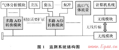該系統(tǒng)采用分布式信號(hào)采集、集中式數(shù)據(jù)計(jì)算處理體系結(jié)構(gòu),如圖1所示。系統(tǒng)中大部分傳感器都是模擬量信號(hào)輸出,包括氣體組分、濃度、泵沖、立壓、套壓等傳感器,通過(guò)組合式多路A/D轉(zhuǎn)換模塊對(duì)其進(jìn)行遠(yuǎn)程實(shí)時(shí)信號(hào)采集處理和控制。其他以數(shù)字信號(hào)輸出的傳感器則直接連接A/D轉(zhuǎn)換模塊的輸出總線并與主計(jì)算機(jī)系統(tǒng)進(jìn)行數(shù)字化信號(hào)傳輸。A/D轉(zhuǎn)換模塊輸出的總線信號(hào)通過(guò)無(wú)線收發(fā)模塊與主計(jì)算機(jī)系統(tǒng)進(jìn)行無(wú)線傳輸,減輕了在復(fù)雜的井場(chǎng)環(huán)境中布線的工作量。根據(jù)實(shí)際情況,系統(tǒng)可以增加A/D模塊和各種不同類型的傳感器來(lái)滿足測(cè)量與監(jiān)控的需要。