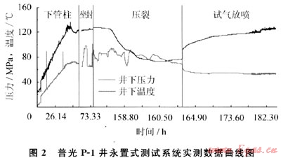 現(xiàn)場(chǎng)安裝施工完成后錄取了坐封、酸壓、試氣等過(guò)程完整的井下數(shù)據(jù),監(jiān)測(cè)坐封井下壓力99.32MPa;3個(gè)多小時(shí)的酸壓施工過(guò)程中,監(jiān)測(cè)井下最高壓力94.24MPa;試氣放噴過(guò)程中,監(jiān)測(cè)井下最高溫度137.13℃。經(jīng)受住了長(zhǎng)時(shí)間的高壓環(huán)境、高溫、高H2S腐蝕及酸液腐蝕的T作要求。為普光氣田進(jìn)一步優(yōu)化酸壓施工提供依據(jù),為開(kāi)發(fā)井準(zhǔn)確評(píng)價(jià)產(chǎn)能及儲(chǔ)層動(dòng)態(tài)分析提供了準(zhǔn)確的基礎(chǔ)數(shù)據(jù)。施工數(shù)據(jù)見(jiàn)圖2。