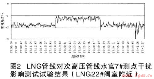 由于部分路段次高壓天然氣管道與上游LNG管道和成品油管道并行(采用外加電流陰極保護(hù)),為了判斷LNG管線對(duì)次高壓管線的影響,技術(shù)人員進(jìn)行了現(xiàn)場(chǎng)測(cè)試,主要包括:LNG管線的保護(hù)電位、次高壓管線保護(hù)電位,并在LNG管線平湖門(mén)站陰極保護(hù)站恒電位儀開(kāi)10分鐘一停10分鐘一開(kāi)10分鐘共30分鐘的時(shí)間段內(nèi),用記錄儀檢測(cè)了次高壓管線的陰極保護(hù)電位波動(dòng)情況。通過(guò)檢測(cè)發(fā)現(xiàn),LNG管線和次高壓管線閉路電位都不穩(wěn),波動(dòng)較大。