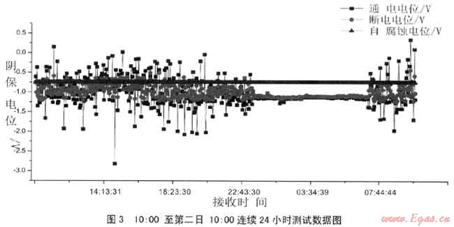 (3) 通過圖表不同時間段的數(shù)據(jù)分析可以看到,遠程監(jiān)測系統(tǒng)可以實時、連續(xù)的監(jiān)測一天24小時之內的自然電位、通電電位和斷電電位的變化情況,對管道安全穩(wěn)定運行提供了科學的管理依據(jù)。