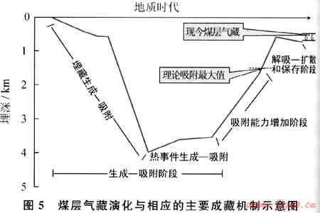 煤層氣成藏演化伴隨著煤層的沉積、埋藏變質(zhì)和抬升的演化過(guò)程。我國(guó)除變質(zhì)程度較低的含煤盆地外,絕大多數(shù)含煤盆地都經(jīng)歷了沉降和回返抬升演化階段,有的盆地甚至經(jīng)歷了多次的旋回。煤層的埋藏-抬升決定了煤層氣的成藏演化經(jīng)歷生成和吸附、吸附能力增加和解吸、擴(kuò)散、保存階段(圖5)。保存條件是控制現(xiàn)今煤層氣富集的關(guān)鍵,現(xiàn)今煤層氣藏的形成取決于構(gòu)造控藏關(guān)鍵時(shí)刻。這一關(guān)鍵時(shí)刻不等同于常規(guī)天然氣成藏的關(guān)鍵時(shí)刻,它是指地質(zhì)歷史時(shí)期煤層生烴終止后具有最小埋藏深度的時(shí)間。