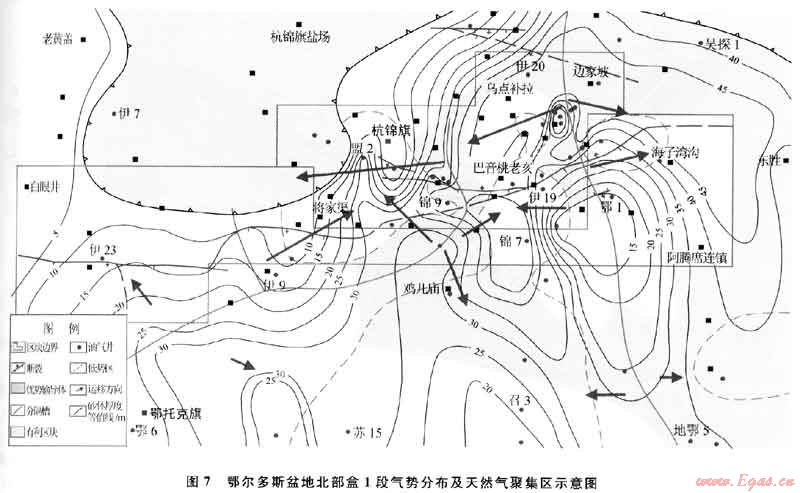 常規(guī)油氣圈閉機(jī)制是在儲(chǔ)層中有被油氣高等勢(shì)面封閉形成的油氣低勢(shì)區(qū),這種低勢(shì)區(qū)是一個(gè)孔隙、滲透性巖體,是聚集、保存油氣的場(chǎng)所,位置具有明顯的可預(yù)測(cè)性。這說(shuō)明,常規(guī)油氣的聚集取決于油氣勢(shì)的太小,高部位一般具有低油氣勢(shì),是油氣運(yùn)移的指向,目此,常規(guī)油氣主要聚集于背斜構(gòu)造。常規(guī)天然氣在運(yùn)移過(guò)程中主要受浮力、毛細(xì)管力和地層水的水動(dòng)力3種作用力的共同控制。天然氣在地層中不同位置的勢(shì)能不同,由于氣勢(shì)梯度的存在,天然氣會(huì)沿著氣勢(shì)減』、的最大方向(負(fù)氣勢(shì)梯度方向)從高氣勢(shì)區(qū)向低氣勢(shì)區(qū)運(yùn)移(圖6)。運(yùn)移的結(jié)果是天然氣進(jìn)入自身勢(shì)能最1、的區(qū)域后不再發(fā)生運(yùn)移,達(dá)到平衡狀態(tài)后聚集成藏。如通過(guò)對(duì)鄂爾多斯盆地北部二疊系石盒子組盒1段氣勢(shì)的分析發(fā)現(xiàn),天然氣聚集區(qū)主要發(fā)育于低氣勢(shì)區(qū)(圖7)。