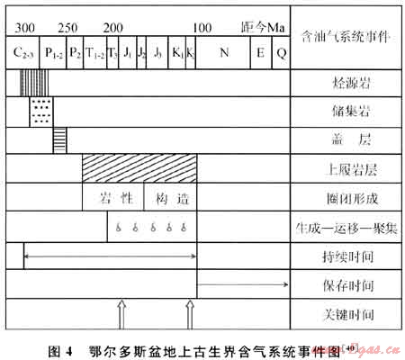 常規(guī)天然氣的成藏演化過(guò)程一般經(jīng)歷3個(gè)階段:生成階段、運(yùn)移和聚集階段、保存和破壞階段。氣藏演化不一定經(jīng)歷晚期抬升過(guò)程,烴源巖、儲(chǔ)層和蓋層等靜態(tài)要素和天然氣生成、運(yùn)移、圈閉形成和成藏等過(guò)程的動(dòng)態(tài)地質(zhì)作用的最佳時(shí)空匹配是其成藏的關(guān)鍵。如鄂爾多斯盆地上古生界天然氣成藏要素及地質(zhì)作用的最佳匹配時(shí)間(關(guān)鍵時(shí)刻)是早侏羅世和晚白堊世[40](圖4)。