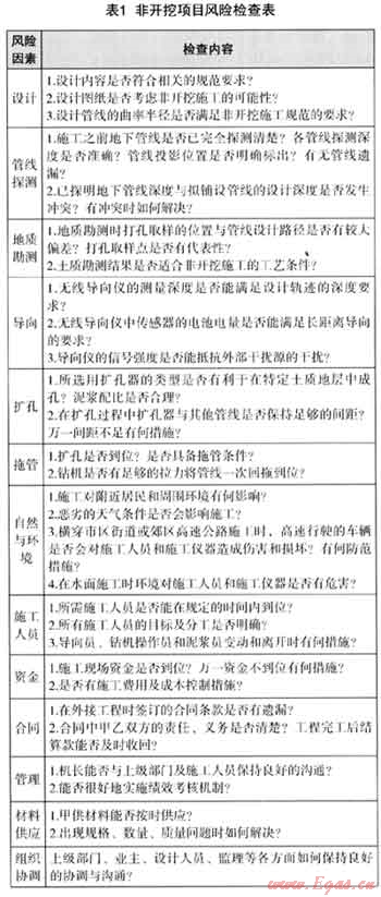 我們根據(jù)多年的非開挖施工經(jīng)驗,在實踐中逐步總結,形成了一個初步的識別非開挖項目風險因素檢查表,通過風險識別檢查表,我們可以按照系統(tǒng)化、規(guī)范化的要求去識別非開挖項目的各種風險因素。(見表1)