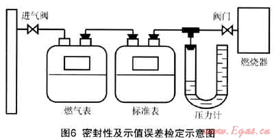 燃氣表出口或燃氣表后其它管道位置連接壓力計,如圖6所示。打開進氣閥,燃氣壓力經(jīng)燃氣表與壓力計達到平衡,壓力計顯示燃氣工作壓力。關(guān)閉進氣閥,保持3min,氣路系統(tǒng)應(yīng)不漏氣。