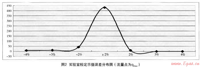 可以看出:對于qmax流量點,實驗室檢定示值誤差在±2%以內(nèi)的為429臺,比例84%,示值誤差在±3%以NN為479臺,比例93.8%,±4%以內(nèi)的為490臺,比例96%,如果按照±4%為合格區(qū)間,則現(xiàn)場檢定的儀表合格率可達95%以上,說明近95%的儀表是合格的,可以繼續(xù)使用。圖2所示的曲線是一個典型的正態(tài)分布,其數(shù)值的絕大部分(96%)都在合格區(qū)間內(nèi)。