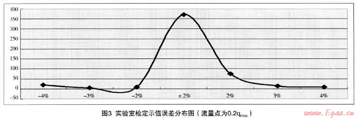 對于0.2qmax流量點,實驗室檢定示值誤差在±2%以內(nèi)的為370臺,比例72.5%,示值誤差在±3%以內(nèi)的為453臺,比例88.8%,±4%以內(nèi)的為473臺,比例92.7%.如果按照±4%為合格區(qū)間,則現(xiàn)場檢定的儀表合格率可達92.7%,與大流量點檢定合格率比較接近,說明90%以上的儀表是合格的.可以繼續(xù)使用。圖3所示的曲線是一個典型的正態(tài)分布,其數(shù)值的絕大部分(約93%)都在合格區(qū)間內(nèi)。