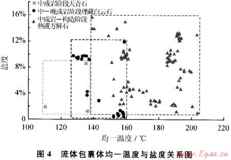 根據(jù)對(duì)充填溶蝕孔洞的各成巖階段3類(lèi)13件次生礦物樣品的流體包裹體測(cè)定結(jié)果(圖4):中成巖階段天青石均一溫度為110~136℃,平均值為127℃,鹽度(NaCl質(zhì)量分?jǐn)?shù),下同)變化范圍為1.23%~8.68%,平均值為3.94%;中-晚成巖階段異形白云石均一溫度介于127~159℃,平均值為143℃,鹽度變化范圍為0.35%~11.93%,平均值為6.8%;晚成巖階段熱液方解石均一溫度介于139~203.8℃,平均值為172℃,鹽度變化范圍為1.23%~15.67%,平均值為8.2%。顯然,上述3類(lèi)次生礦物都為溫度和鹽度逐漸升高的具熱鹵水性質(zhì)的成巖流體沉淀物。