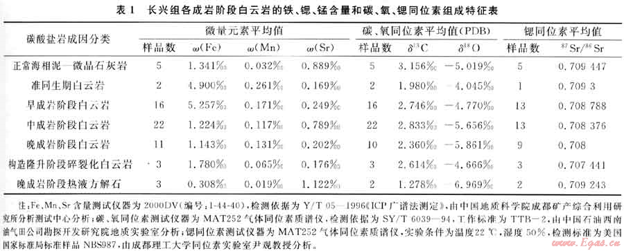 46件樣品的鍶同位素地球化學(xué)特征有如下基本特點(diǎn):①正常海相泥 微晶石灰?guī)r87Sr/86Sr比值為0.708742~0.710519,平均值為0.709447,明顯高于全球晚二疊世海水[17]和上揚(yáng)子同期海相碳酸鹽巖87Sr/86Sr比值[18],原因可能與石灰?guī)r中含有微量富87Sr的泥質(zhì)組分有關(guān),據(jù)其Mn/Sr比值僅為0.036,而Sr的平均豐度高達(dá)0.889‰,反映其未遭受較強(qiáng)的成巖蝕變作用,因此,這一較高的87Sr/86Sr比值仍可作為判斷白云巖鍶同位素地球化學(xué)特征的對(duì)比標(biāo)準(zhǔn)(圖3);②準(zhǔn)同生白云巖87Sr/86Sr比值與泥-微晶灰?guī)r較接近并顯著地高于各成巖階段埋藏白云巖(表1、圖3),說(shuō)明準(zhǔn)同生白云巖化流體源于同期海源水;③長(zhǎng)興組成巖白云巖87Sr/86Sr比值遠(yuǎn)低于同期海相泥微晶石灰?guī)r,而與飛仙關(guān)組成巖白云巖相似且具有相同的分布規(guī)律,為確定長(zhǎng)興組成巖期埋藏白云巖化流體主要來(lái)源于飛仙關(guān)組封存的高M(jìn)g鹵水提供了依據(jù)[18];④在高M(jìn)g鹵水交代長(zhǎng)興組海相石灰?guī)r的白云巖化過(guò)程中,因長(zhǎng)興組海相石灰?guī)r本身所具有相對(duì)較富87Sr的性質(zhì)(與其含有微量富87Sr的泥質(zhì)組分有關(guān)),致使交代成因的長(zhǎng)興組埋藏白云巖也具有比飛仙關(guān)組略高的87St/86Sr值,但隨著交代過(guò)程中87Sr消耗量加大,流體中87Sr濃度逐漸降低,因而出現(xiàn)伴隨成巖強(qiáng)度加大白云巖87St/86Sr比值在各成巖階段中依次降低的變化趨勢(shì)(圖3);⑤充填中、晚成巖階段溶蝕孔、洞、縫的熱液方解石87St/86Sr比值略低于海相泥-微晶石灰?guī)r和準(zhǔn)同生白云巖,但高于埋藏白云巖,并以其Sr含量很高和往往與更晚期的次生石英共生的特點(diǎn),推斷其為含有深部流體加入的混合熱液沉淀物。