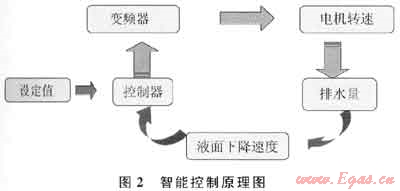 智能控制系統(tǒng)由地面部分和井下部分組成。通過采集井下壓力計或地面流量計信號,根據(jù)煤層氣單井排采規(guī)律,地面人工預(yù)先設(shè)定井底流壓變化值,由智能控制系統(tǒng)自動閉環(huán)控制排采系統(tǒng)的工作參數(shù)(電機轉(zhuǎn)速或頻率),實現(xiàn)了井底流壓的智能控制。其控制原理如圖2所示。