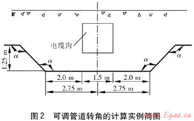 下面舉一個(gè)工程實(shí)例。在燃?xì)夤艿赖目v斷圖設(shè)計(jì)中遇到一處電纜溝,采用可調(diào)管道轉(zhuǎn)角的計(jì)算方法進(jìn)行計(jì)算,可調(diào)管道轉(zhuǎn)角的計(jì)算實(shí)例簡(jiǎn)圖見(jiàn)圖2。