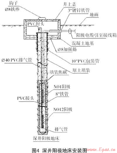 公司于2011年3月首先啟動了區(qū)域二的深井陽極電流保護工程。經(jīng)計算管道保護面積為19631m2,設計保護電流密度為1OmA/m2,保護總電流為196A,在南浦氣化站和位于車站大道的公用集團內(nèi)各設置1座深井陽極陰極保護站。每個站內(nèi)設100A/100V恒電位儀2臺,一開一備。在站內(nèi)距離管線50m~1OOm的低洼潮濕、土層較厚處鉆建直立式陽極地床,井深60m,井內(nèi)裝分段預制型陽極體7組,規(guī)格為Φ325×6000,內(nèi)裝Φ75×1500高硅鑄鐵陽極3支。將高硅鑄鐵陽極、高性能碳素填料,PVC排氣管,部分陽極引線電纜,井套管組合裝配為一體,便于運輸和安裝,并可保證裝配精度和質(zhì)量(圖4)。每500m左右設置一個測試樁或在原有閥門外內(nèi)設置測試點。對于平行或跨越管道按一定間距或在最接近處作均壓處理,使電位分布均衡。