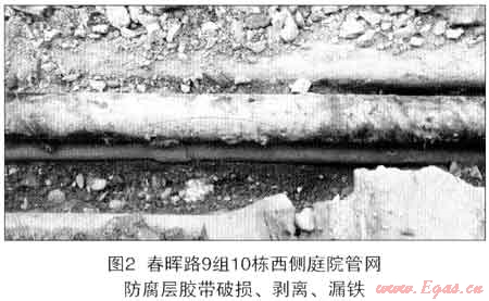 按照SY/T0087—95《鋼質(zhì)管道及儲罐腐蝕與防護調(diào)查方法標準》,破損缺陷≥8處/1Okm鋼質(zhì)管網(wǎng)評級為“差”。在公司長達130km埋地鋼質(zhì)管網(wǎng)中,共檢出防腐層破損缺陷303處,超過23處/km,顯然管道防腐層屬“差”的等級。開挖發(fā)現(xiàn)防腐層缺陷包括以下幾種形態(tài):(1)施工時未防腐;(2)施工時創(chuàng)傷(包括點狀和帶狀),此種情形占據(jù)了大部分,觸目驚心(見圖2);(3)防腐層經(jīng)長時間浸水起泡;(4)管線彎又、三通、四通等部位防腐施工質(zhì)量差;(5)入戶管線出土處腐蝕較普遍。防腐層缺陷處管道本體腐蝕包括點狀腐蝕和面狀腐蝕,其中以點狀腐蝕危害為重,嚴重處已穿孔漏氣。