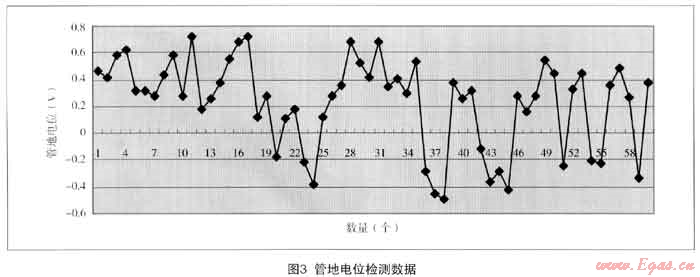 對整體管道的自然電位測試和原犧牲陽極保護系統(tǒng)進行測試,大部分管道處在自然腐蝕電位狀態(tài)(-0.45v,Cu/CuS04參比電極),所測的60處管地電位在-0.49V~-0.72V之間波動(見圖3),其中正值占77%,最負值-0.49V,達不到管道陰極保護電位(即管/地界面極化電位)要求的-0.85V,即管道運行沒有處于陰極保護狀態(tài)。