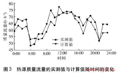 熱源質(zhì)量流量的實測值與計算值隨時間的變化見圖3。由圖3可知,除9:00和17:00偏差較大外,其余時刻相對誤差均在±10%以內(nèi),全天質(zhì)量流量的計算值與實測值的平均相對誤差為-4.1%。由于9:00與17:00為上、下班時間,管網(wǎng)流量波動較大,系統(tǒng)處于非穩(wěn)態(tài),因此計算值與實測值偏差較大。