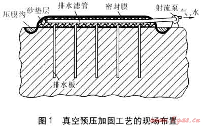 在采用真空預(yù)壓加固軟土地基時,在密封膜上不施加重物,而把大氣作為荷載。在抽氣時,土體孔隙中的氣體首先被抽出,使密封膜緊貼于砂墊層上。砂墊層中形成的負壓,通過排水板逐漸向下延伸,并由排水板向其周圍土體傳遞,引起土體中孔隙水壓力降低,從而使土體孔隙中的水由土體向排水板滲流,最后匯至砂墊層中被射流泵排出。淺層真空預(yù)壓加固與深層真空預(yù)壓加固工藝的主要區(qū)別在于,前者采用編織布、無紡?fù)凉げ嫉忍娲皦|層,以及排水濾管的布置方式不同。真空預(yù)壓加固工藝的現(xiàn)場布置見圖1。