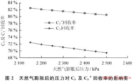 天然氣經膨脹機組膨脹后的壓力對C3及C3+回收率的影響如圖2所示。