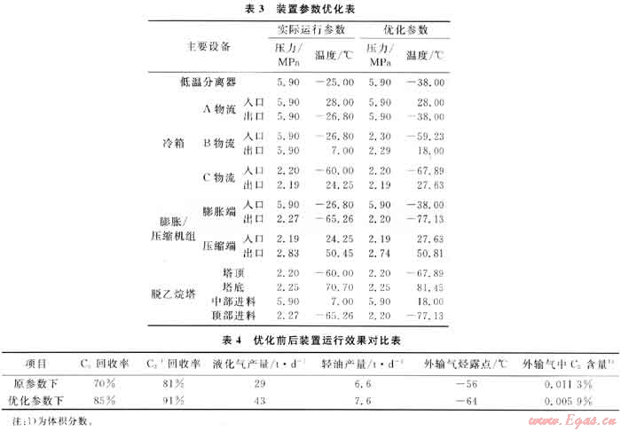 對原裝置在不作重大改造的前提下,利用HYSYS軟件對實際工藝過程進行優(yōu)化,以得到較高的C3及C3+回收率。裝置參數優(yōu)化情況見表3,參數優(yōu)化前后裝置運行效果對比情況見表4。