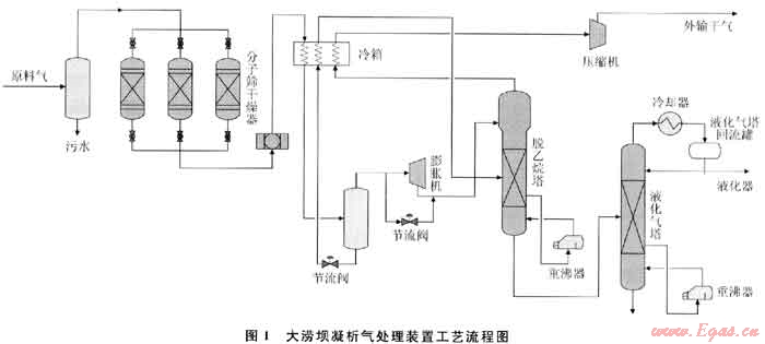 脫水后的天然氣經粉塵過濾器除去分子篩粉塵,再經冷箱預冷后,進入低溫分離器,將部分重烴液體從氣相中分離出來。離開低溫分離器的氣相進入膨脹/壓縮機組的膨脹端,經過膨脹降溫后的物流作為脫乙烷塔塔頂分離器的進料。離開低溫分離器的液相經過節(jié)流閥后進入冷箱,在冷箱復熱后作為脫乙烷塔中部的進料。