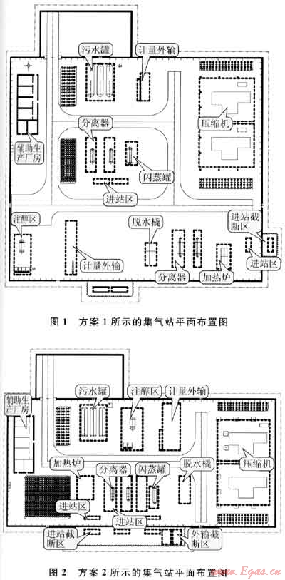 對(duì)比2個(gè)方案可以看出:方案1占地面積大,但上古生界氣藏氣井的集輸流程和上、下古生界氣藏合采氣井的集輸流程分開布置,便于管理;方案2占地面積小,設(shè)備布置較為緊湊。對(duì)于新建場(chǎng)站,推薦采用方案用效果還有待觀察。