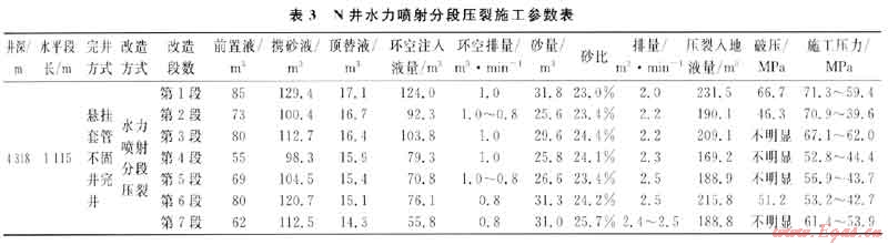 該井7段水力噴射分段壓裂,累計(jì)加砂量201.7m3,累計(jì)環(huán)空注入液量602.1m3,壓裂注入液量1393.4m3,一點(diǎn)法測(cè)得無(wú)阻流量21.1187×104m3/d,是鄰井直井無(wú)阻流量的3.63倍,改造效果較好。具體施工參數(shù)如表3所示。