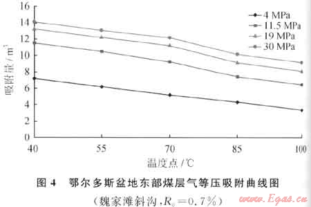 已有研究表明,等壓條件下不同煤階煤的吸附量隨溫度增加均減小[7~10]。鄂爾多斯盆地東部煤層氣吸附實(shí)驗(yàn)顯示,在等壓條件下,煤的甲烷吸附量隨溫度增高呈線性降低,高溫高壓階段溫度增加引起的吸附量降低更為顯著(圖4)。