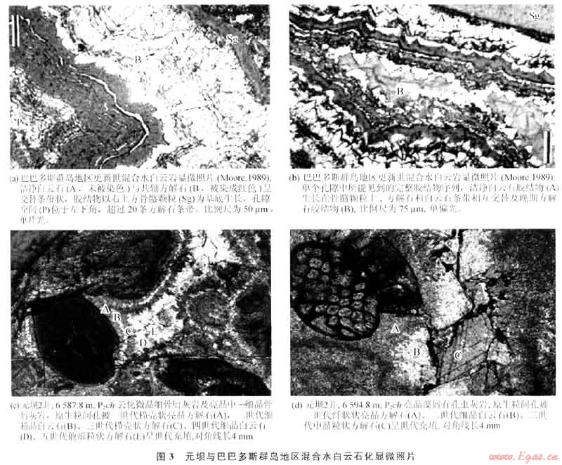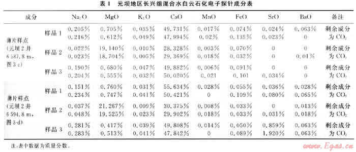 通過對比分析巴巴多斯群島更新世碳酸鹽巖混合水白云石化的情況(圖3~a,b)[5],發(fā)現(xiàn)元壩地區(qū)長興組生屑灰?guī)r混合水白云石化(圖3-c,d)與其有很大的相似性:①白云石膠結物的量較低并且分布不連續(xù);②白云石膠結物經(jīng)常作為幾個不連續(xù)的透明白云石膠結物帶出現(xiàn),且被夾于透明方解石膠結物之間;③白云石干凈、明亮,方解石膠結物晶體形態(tài)從纖狀、粒狀、粉晶、中晶、巨晶不等,各期次膠結特征是晶體依次增大;④沉淀白云石膠結物的水體有很寬的組分范圍,根據(jù)電子探針對長興組白云巖微量元素分析,Sr0、Na20、K2O表現(xiàn)為較低值,說明大部分白云石形成有淡水的加入[6](表1)。