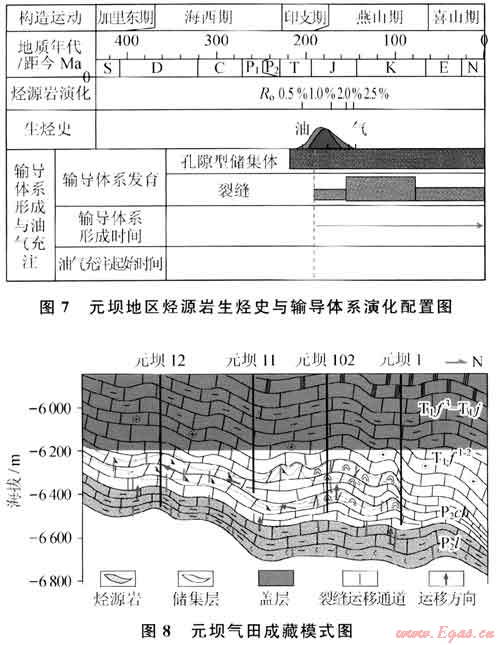 晚印支期,上二疊統(tǒng)龍?zhí)督M烴源巖進(jìn)入生油門(mén)限,此時(shí)元壩地區(qū)構(gòu)造活動(dòng)微弱,沒(méi)有形成油氣垂向運(yùn)移通道。早燕山期,龍?zhí)督M烴源巖進(jìn)入生油高峰早期,受盆緣造山作用擠壓影響,該區(qū)發(fā)育了構(gòu)造節(jié)理,垂向上溝通龍?zhí)督M源巖,長(zhǎng)興組礁灘相儲(chǔ)層與裂縫構(gòu)成油氣垂向輸導(dǎo)與側(cè)向匯聚的輸導(dǎo)體系,使得原油得以在長(zhǎng)興組聚集形成巖性油藏(圖7、8)。中燕山期(距今約150Ma)以來(lái),受盆緣造山作用的影響,該區(qū)進(jìn)一步沉降,古油藏深埋,儲(chǔ)層溫度超過(guò)160℃,原油開(kāi)始大量裂解形成氣藏。此期間,上二疊統(tǒng)烴源巖進(jìn)入生氣階段,層間構(gòu)造節(jié)理進(jìn)一步發(fā)育,與儲(chǔ)集體側(cè)向輸導(dǎo)通道一起構(gòu)成輸導(dǎo)體系,繼續(xù)為烴源巖生成的天然氣提供垂向輸導(dǎo)通道。晚燕山期以來(lái),受米倉(cāng)山和大巴山造山運(yùn)動(dòng)的影響,元壩地區(qū)地層產(chǎn)狀發(fā)生了小幅度的變化。由于元壩地區(qū)飛三段至雷口坡組發(fā)育數(shù)百米厚的膏巖蓋層,形成了區(qū)域性優(yōu)質(zhì)蓋層,為天然氣保存提供了保障。因此,適時(shí)的裂縫發(fā)育、大面積發(fā)育的礁灘相白云巖儲(chǔ)層與烴源巖生烴高峰的有效匹配是氣藏形成的關(guān)鍵。