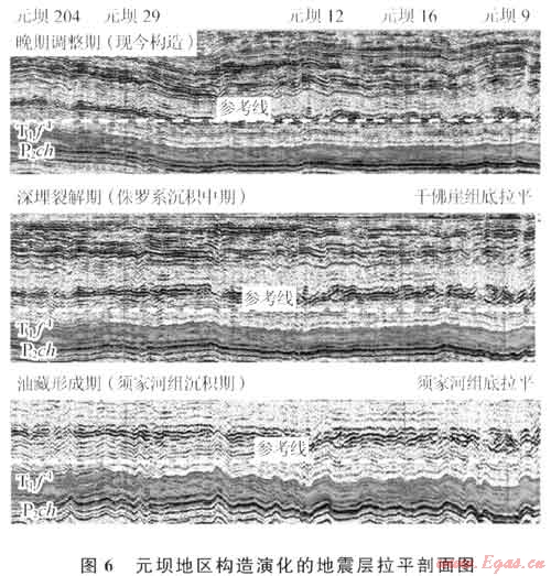 早侏羅世沉積末,長(zhǎng)興組埋深超過(guò)5000m,烴源巖進(jìn)入生油高峰,中晚侏羅世沉積時(shí)期,從生油高峰向古油藏裂解為氣藏轉(zhuǎn)化。區(qū)域地質(zhì)研究成果表明,大巴山、米倉(cāng)山的隆起與褶皺時(shí)期也在晚侏羅世末期,而向盆地內(nèi)的遞進(jìn)變形應(yīng)該在稍晚的早白堊世,利用地震資料層拉平技術(shù)證明了這一點(diǎn)(圖6),元壩9井古油水界面深于現(xiàn)今氣水界面也證明了這一點(diǎn)。雖然整個(gè)元壩探區(qū)構(gòu)造變形較弱,但巖心和成像測(cè)井資料顯示,長(zhǎng)興組儲(chǔ)層發(fā)育中一高角度裂縫,多口井巖心都見(jiàn)到未有充填物的裂縫發(fā)育,地震剖面上逆斷層一般發(fā)育在下三疊統(tǒng)嘉陵江組至下侏羅統(tǒng)自流井組,而中侏羅統(tǒng)千佛巖組以上常見(jiàn)正斷層發(fā)育。因此,可以得出結(jié)論,印支晚期-燕山早期的構(gòu)造運(yùn)動(dòng)控制了古油藏的形成,由于烴源巖分布面積大、位于儲(chǔ)層附近,古油藏的分布范圍大于今氣藏;中晚燕山運(yùn)動(dòng)以來(lái),隨著龍門(mén)山、米倉(cāng)山、大巴山對(duì)盆內(nèi)的持續(xù)擠壓,構(gòu)造分異更加明顯,九龍山背斜基本定型;原油裂解和深埋高溫導(dǎo)致的硫酸鹽熱化學(xué)還原作用(TSR)形成的酸性流體以及構(gòu)造作用產(chǎn)生的大量裂縫不僅促進(jìn)了埋藏溶蝕作用的發(fā)生和優(yōu)質(zhì)儲(chǔ)層的形成,也促進(jìn)了氣藏的調(diào)整與富集。