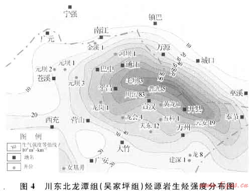 川東北地區(qū)龍?zhí)督M(吳家坪組)泥頁(yè)巖呈區(qū)域性分布,在元壩地區(qū)該地層過(guò)渡為吳家坪組。其暗色泥灰?guī)r及黑色泥質(zhì)巖厚40~80m;總有機(jī)碳含量值變化在0.27%~7.20%范圍,平均值為2.90%(元壩3井)。本區(qū)該套烴源巖有機(jī)質(zhì)類型以混合型為主,在早侏羅世進(jìn)入生油高峰期,中侏羅世末達(dá)到生氣演化期,現(xiàn)今實(shí)測(cè)Ro值大多在2%~3%之間,有機(jī)質(zhì)處于過(guò)成熟干氣演化階段,生氣強(qiáng)度主要分布在20×108~30×108m3/km2之間(圖4),具有形成大氣田的氣源條件。