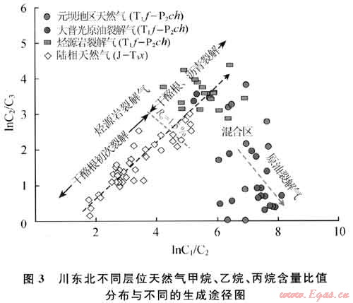 元壩氣田長(zhǎng)興組儲(chǔ)層中普遍見(jiàn)有固體瀝青,表明地史上形成過(guò)古油藏并發(fā)生了原油裂解作用。根據(jù)大普光和通南巴地區(qū)實(shí)際氣藏分析資料的綜合對(duì)比及模擬實(shí)驗(yàn)數(shù)據(jù)[10],發(fā)現(xiàn)這兩類天然氣在lnC1/C2、lnC2/C3比值分布上有明顯差別(圖3)。烴源巖裂解氣的lnC1/C2值較低,大多在6.0之下;而lnC2/C3值較高,均在2.5以上,并隨熱演化程度的增加而變大。原油裂解氣的lnC1/C2值較高,大都在6.0以上;lnC1/C2值較低,大多在2.0之下,與前類天然氣形成區(qū)別。如圖3所示,元壩地區(qū)的飛仙關(guān)-長(zhǎng)興組天然氣總體上呈高lnC1/C2、低lnC2/C3值的原油裂解氣組成特點(diǎn)。它們的lnC1/C2值基本上都在6.0以上,且多數(shù)氣樣lnC2/C3值低于2.5,由此可認(rèn)為主要來(lái)源于古油藏原油的裂解作用。同時(shí)在圖3中可觀察到,部分氣樣的lnC2/C3值高于2.5,近于烴源巖裂解氣的分布區(qū),意味著這些天然氣中部分氣源直接來(lái)自烴源巖。