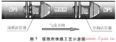 緩蝕劑預(yù)膜采用預(yù)膜型緩蝕劑與柴油按照1:1比例混合,用預(yù)膜球進(jìn)行作業(yè),合理運(yùn)行速度控制緩蝕劑與管道內(nèi)壁接觸時間在5~10s,保證緩蝕劑在管道內(nèi)壁形成3~4mil(1mil=25.39999918μm)的緩蝕劑化學(xué)膜,預(yù)膜工藝見圖7。目前按照30~60d的頻次進(jìn)行緩蝕劑涂膜。