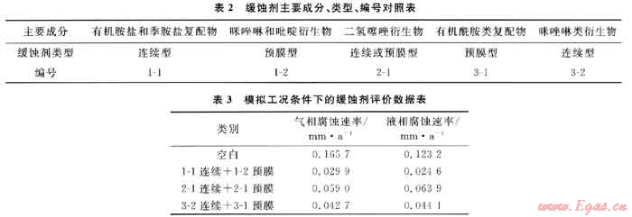 參考SY T 5273—2000油田采出水用緩蝕劑性能評價方法標(biāo)準(zhǔn),結(jié)合普光氣田集輸工藝,研究了連續(xù)型和預(yù)膜型緩蝕劑的模擬工況評價方法,評價條件同1.3。